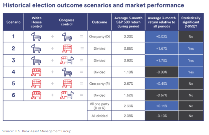 Every four years, we get questions about the impact on portfolios and investment strategy in the context of national elections. We will skip to the conclusion before circling back with some evidence: Markets generally have been more concerned with underlying economic and thematic trends than which party is in power. There is, at best, weak evidence of a short-term relationship between elections and the winning combination of control, and generally no evidence of a long-term relationship.