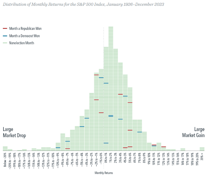 If a particular party winning was better for markets than the other, we would expect to see the red/Republicans won months stack on one side of the distribution, while the blue/Democrats won months would stack on the other side of the distribution. Furthermore, if markets reacted strongly to elections, we would expect to see election months clustered farther to the left or right of the center as an election would necessarily have a large positive or negative return. However, what the graph shows is there is no discernible lopsidedness of outcomes based on which party wins or for election months generally.[i]