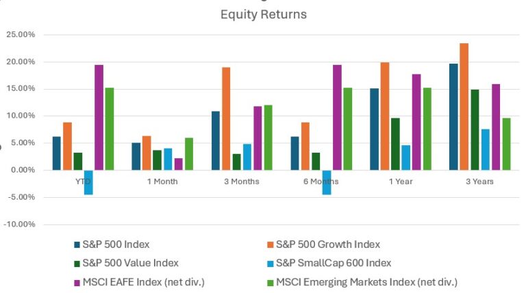Following the tariff announcements on Liberation Day, global markets quickly fell to intra-year lows on April 8 th . As soon as the tariff 90-day reprieve was announced, markets recovered through the end of the quarter. As the chart below shows, the S&P 500 returned 10.9% for the quarter, pulling returns out of negative territory to end the quarter at positive 6.2%. While 10.9% performance for a quarter is impressive, the more impressive number is the 24.5% recovery from the April 8 th bottom through the end of June.