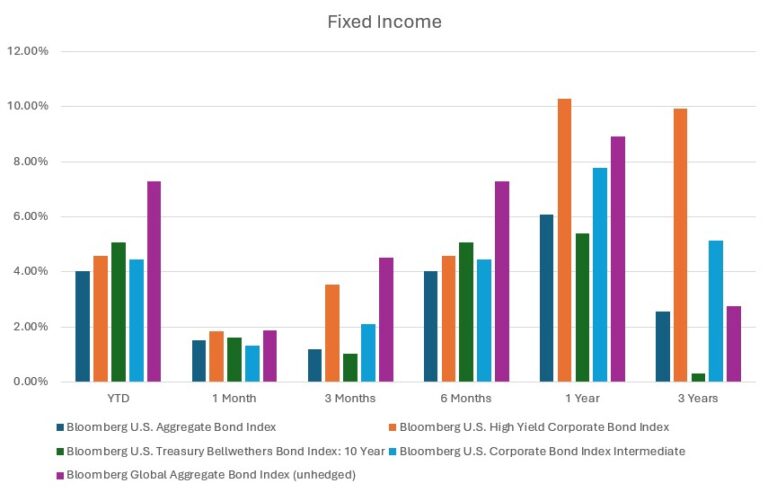 Fixed income returns were positive as interest rate movement was limited. In a year-to-date basis, the outperformance of the global aggregate is driven by the dollar decline.